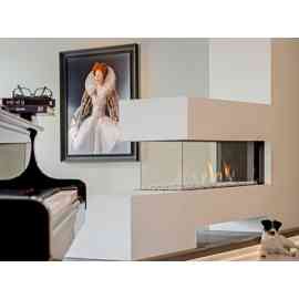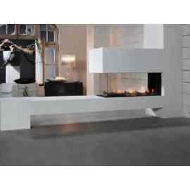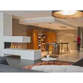 Chimenea a gas sin marco con visión apaisada a tres caras y el patentado quemador por etapas «Step Burner».