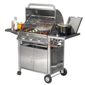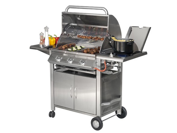 Barbacoa de gas sobre carro en acero inoxidable con 4 fuegos independientes y encendido automático.