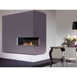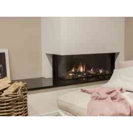 Hogar a gas rinconero sin marco a 2 caras, fabricado con el patentado sistema de Faber «Step Burner».