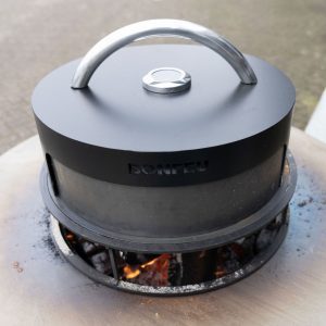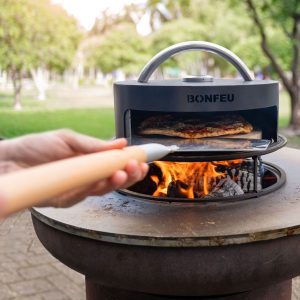 Prepara pizzas crujientes en tu propio horno para pizzas BonBiza. Coloca la BonPizza al fuego, utilizando el soporte BonBiza, y deja que se caliente adecuadamente. El práctico termómetro situado en la parte superior le indica la temperatura dentro del horno de pizza. Una vez que el horno esté caliente, puedes agregar tus propias pizzas y disfrutar de deliciosas pizzas al horno.
