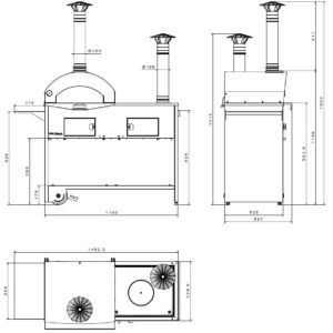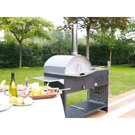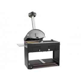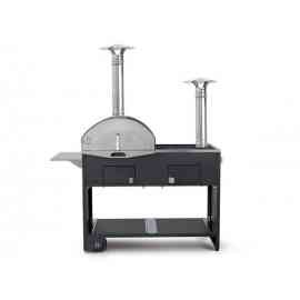 Horno-barbacoa en acero electrocincado barnizado antracita y acero inoxidable. La superficie de cocción es de 45×110 cm ideal para 15 cubiertos. El carro lleva dos ruedas y todos los accesorios de serie. El encendido es muy sencillo gracias a la cámara de combustión creada para facilitar esta operación y para asegurar una estable y uniforme distribución del calor con cada uno de los accesorios. Pizza&Cucina está equipada con un dispositivo que regula la intensidad de la llama, con un práctico sistema para la recuperación y descarga de las cenizas.