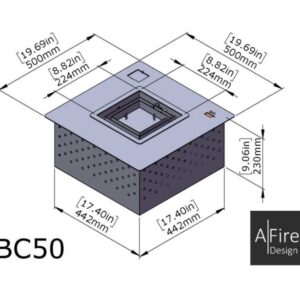 BC 50, quemador de bioetanol con forma del quemador cuadrada. Funcionamiento automático, mando a distancia para el encendido y el apagado del fuego, con detectores automáticos de seguridad AFIRE.