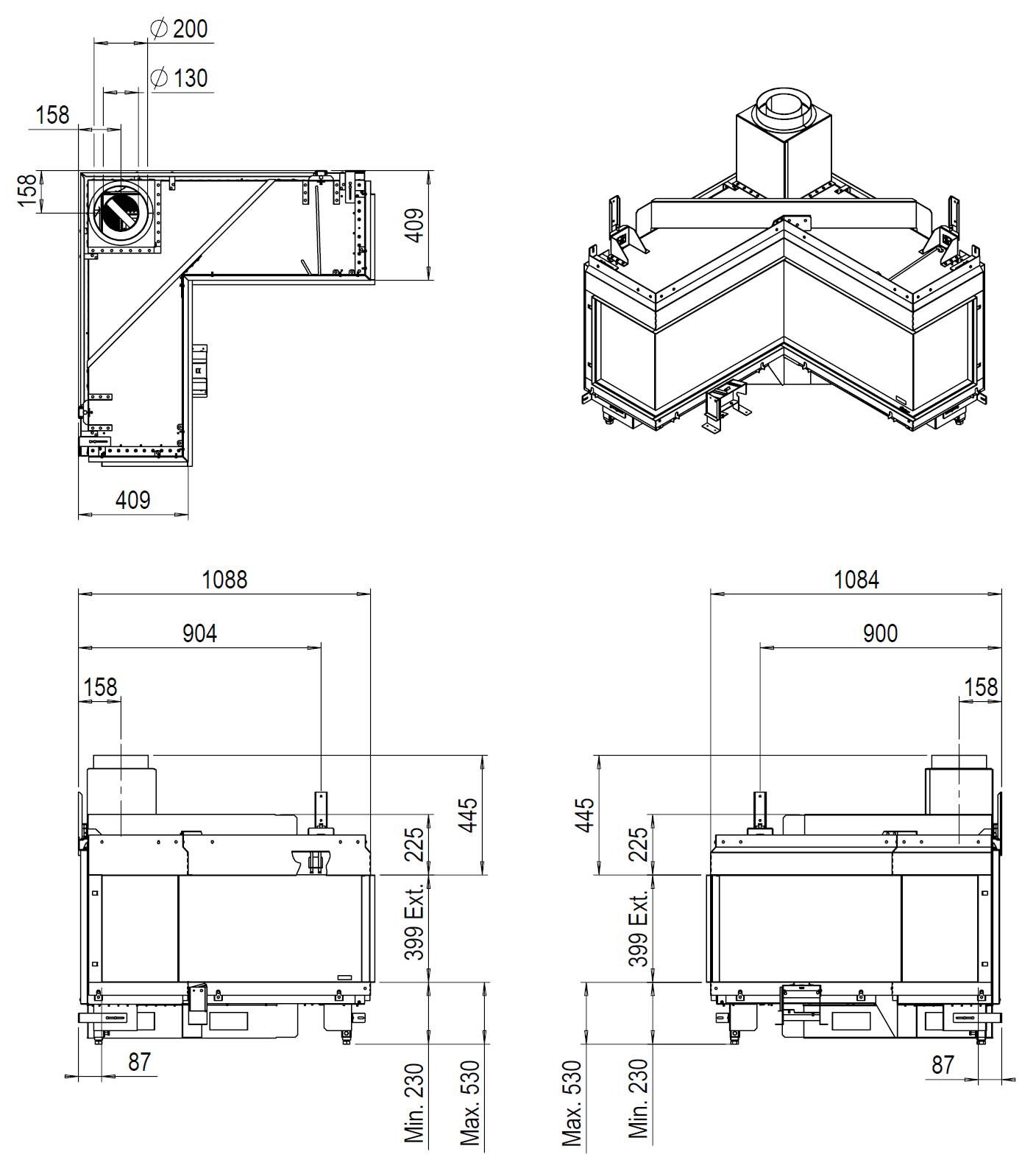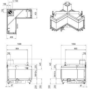 Hogar rinconero sin marco extra ancho para esquina cóncava.