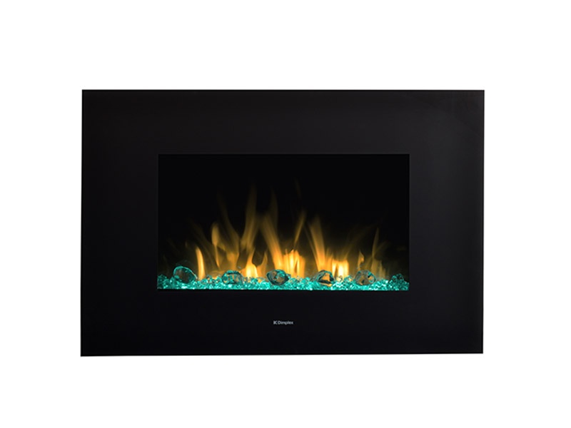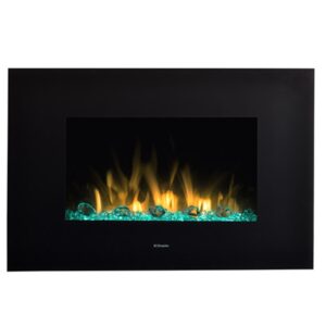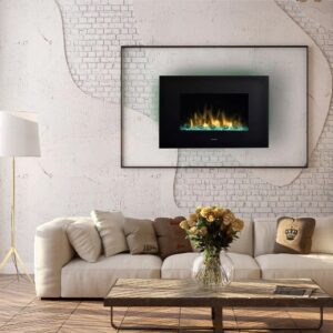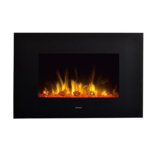 Chimenea eléctrica dotado con el sistema un sistema de iluminación que incluye la posibilidad de variar los colores de las luces. Esta chimenea está pensada para colgar en la pared.