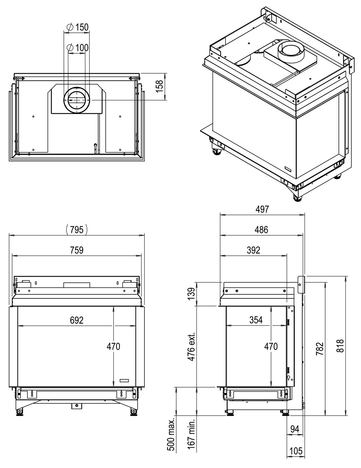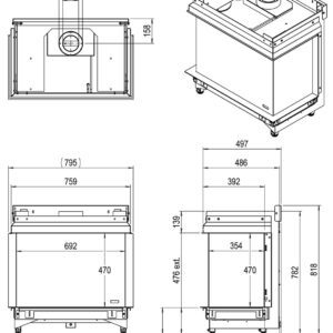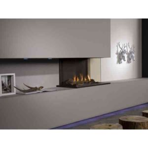 Todos los aparatos de la línea Smart de Faber se suministran sin marco, con efecto leña, 2 rejillas para salida de aire de convección, puerta para registro y quemador Flat Burner.
